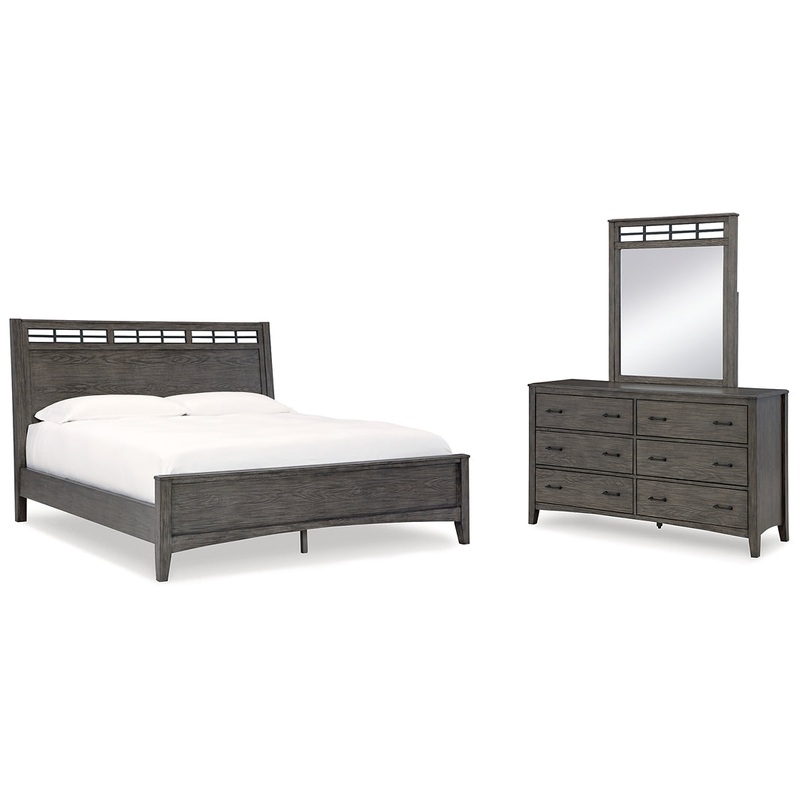 | Details | B651B4: Includes king/California king panel headboard, rails and footboard with slats , Made with hardwood solids and MDF substrates, Medium gray-brown finish with a blackened wood grain contrast; embossed wood grain texture, Lay-back headboard , Decorative inset metal grille with matte black finish , Foundation/box spring required, sold separately, Mattress not included, sold separately, Assembly required, B651B1: Includes dresser and mirror, Made with hardwood solids and MDF substrates, Medium gray-brown finish with a blackened wood grain contrast; embossed wood grain texture, Metal bar pulls with matte black finish, Inset drawers, 6 smooth-gliding drawers with fully finished interiors and metal ball-bearing side glides (top drawers felt lined), Mirror attaches to back of dresser, |