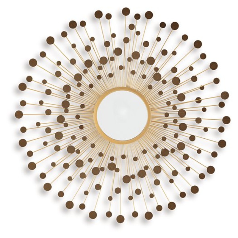 Light and bright, this accent mirror is a trendy take on wall decor. Its metallic spokes splay outward to create a sculpture-like frame. With goldtone and bronze-tone finishes, the piece is a reflection of your eye for contemporary design. More About This
