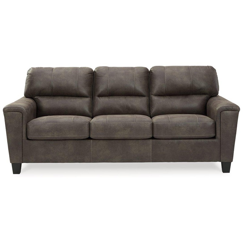 If you love the cool look of leather but long for the warm feel of fabric, you can take comfort in this sofa. Wrapped in a fabulous faux leather with a weathered hue and hint of pebbly texture to resemble the real deal, this decidedly modern sofa proves less is more. Elements include angled side profiling and track armrests wrapped with a layer of pillowy softness for that little something extra. Prominent jumbo stitching and clean-lined divided back styling lend fashion-forward flair.