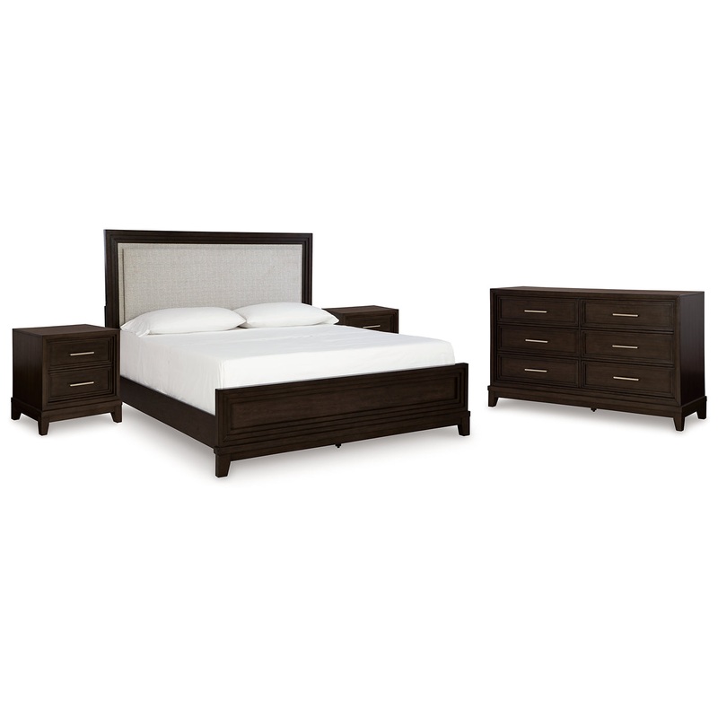 Neymorton California King Upholstered Panel Bed with Dresser and 2 Nightstands