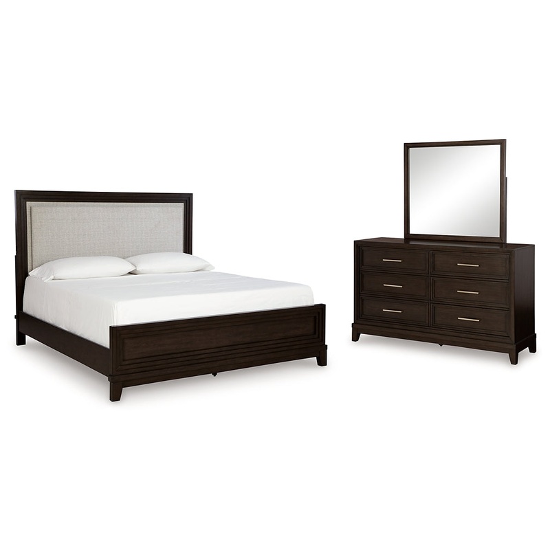 Neymorton King Upholstered Panel Bed with Mirrored Dresser