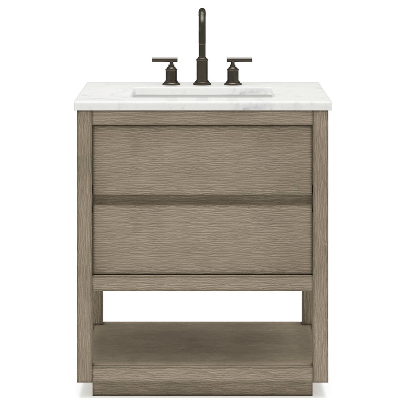 The simple and streamline design makes your bathroom more elegant. Featuring ample storage drawers, the Oakman vanity by Water Creation will be a useful addition to a large bathroom or a small powder room. Dressed to impress with wood grain surface embellishments, this vanity set is such a brilliant choice for rooms with rustic scheme. Grey Oak finish will give the classic styling with aesthetic influence. Combined with Carrara white marble top, the elegantly crafted drawers, and open shelf all give substance to the durability and superior craftsmanship which last a lifetime.