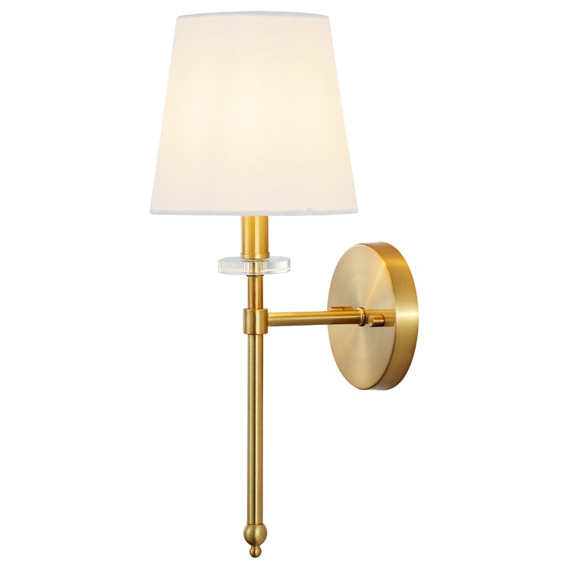 -Our single wall light has an elegant linen shade and glam lucite accents with a modern brass finish