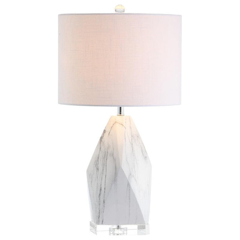 Modern and eye catching, this chic table lamp features an elegant light marble base atop a crystal pedestal. Created with a special glaze process that creates a soft marble-like effect on the faceted ceramic shape, this piece is a modern interpretation of a neoclassical inspiration. The white fabric shade diffuses soft light into any living space, in contrast to the geometric edges of the lower design.