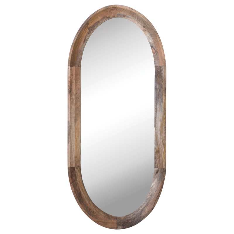 This natural wood oval wall mirror adds style and depth to any living space. This artfully crafted mirror features a sleek wood frame in a natural finish that complements any decor. The mirror is made of mango wood and glass for a durable and elegant look. The mirror has hanging mechanisms for easy installation and can be hung vertically. This mirror is perfect for adding a touch of warmth and simplicity to any living room, bedroom, or bathroom. It measures 21.25 inches wide by 47.25 inches high, making it a perfect size for any space. This mirror is a stunning piece that will add a touch of sophistication to any home.