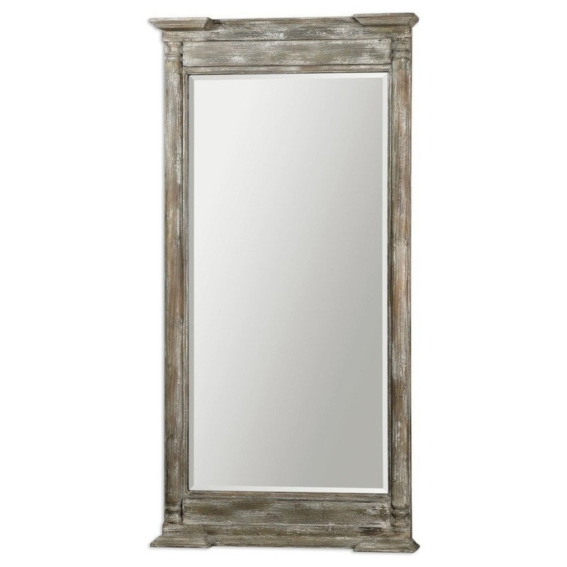 Frame is made of weathered wood covered in a distressed ivory gray finish. Mirror features a generous 1 1/4" bevel. May be hung horizontal or vertical or used as a leaner against the wall. 38'' x 74'' x 4. 75'' - Glass Measurements: 30'' x 60'' Properly we