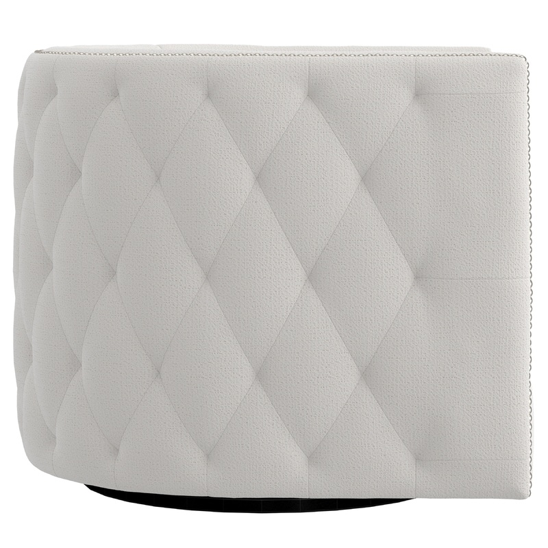 Featuring a barrel back and track arms, the Palazzo swivel chair puts a modern spin on a traditional form, delivering an eclectic feel. Buttonless tufting and nailhead trim create a sophisticated look. The curved shape provides luxurious support and softens the flow of a room.