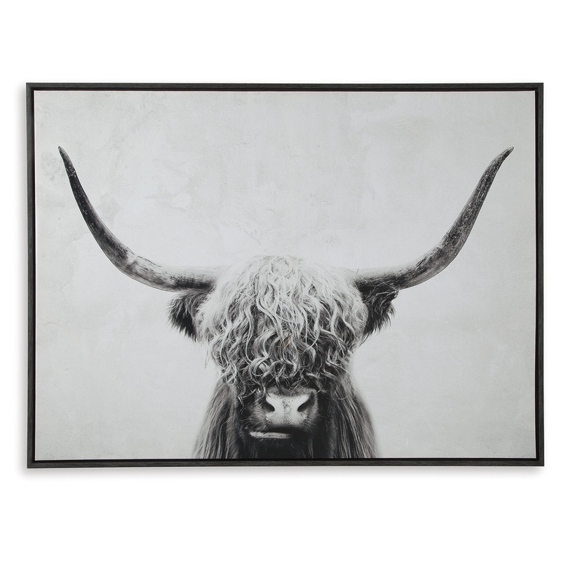 Bring home a piece of Scottish livestock with this wall art. A highland cow looks straight ahead with shaggy hair and prominent horns, creating a beautiful white negative space. The sleek black frame creates a boundary for the piece, which is sure to make a statement in your home.