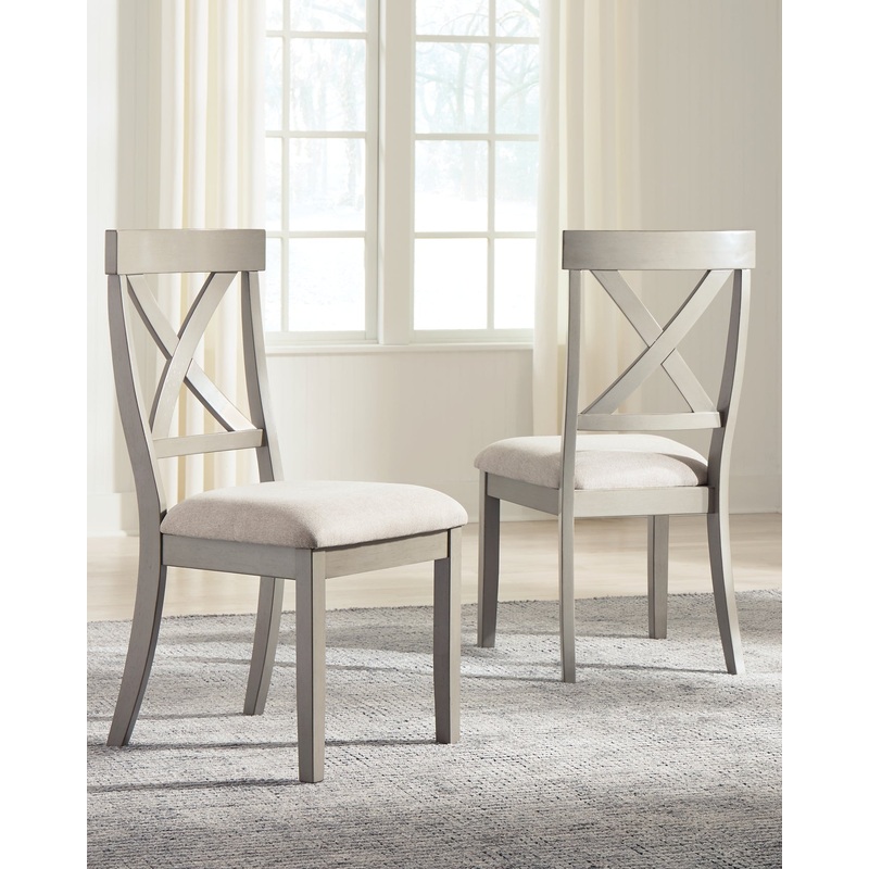 Bring a relaxed yet refined sense of good taste to a space with this wonderfully comfortable dining chair. Clean-lined frame sports a gray finish thats so easy on the eyes. Covered in a complementary textured beige fabric, the chairs cushioned upholstered seat goes easy on the body. And with classic X-back styling, this chair is an inspired choice for modern farmhouse living.