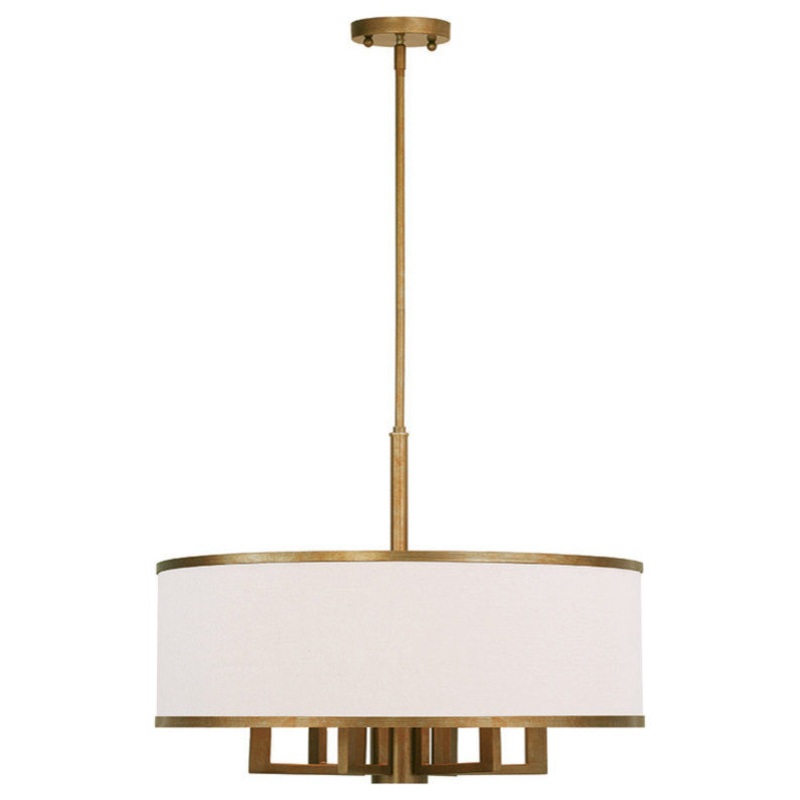 Update your decor with this sleek pendant light design. The angular frame comes in a hand applied antique gold leaf finish which nicely complements the hand crafted parchment color linen fabric hardback shadew hich holds a 6 bulbs and 1 downlight to maximize your light output.