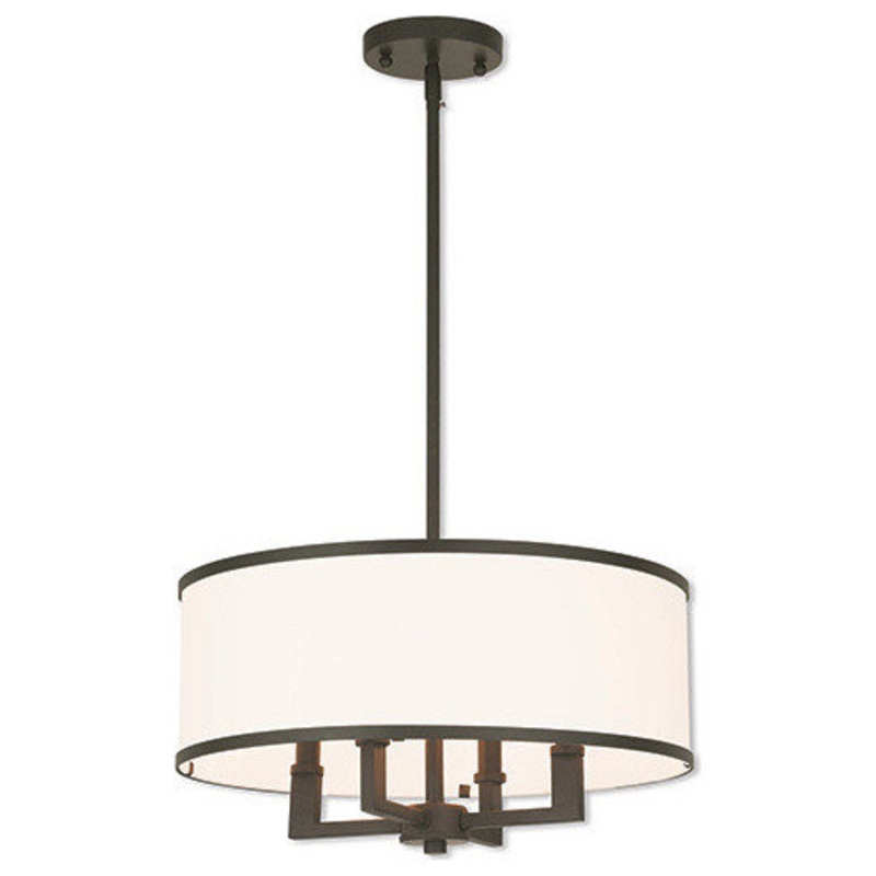 Update your decor with this sleek pendant light design. The angular frame comes in a bronze finish which nicely complements the hand crafted off white fabric hardback shade. -Glass Type/Shade Type: Hand Crafted Off-White Fabric Hardback -Finish: Bronze -Ma