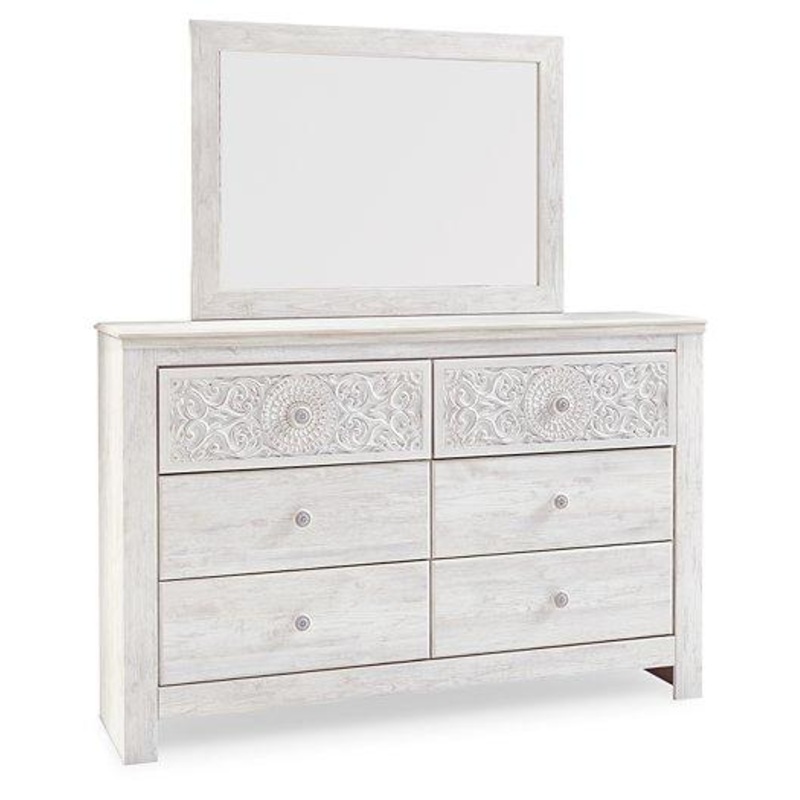 If its coastal chic or cottage quaint style you long for, this whitewashed dresser and mirror set invites you to go to town. Its distinctive weatherworn finish conveys an easy-breezy sensibility: perfect for a restful bedroom retreat. Tastefully edited lines and medallion drawer pulls give this attractively priced dresser a high-end aesthetic.