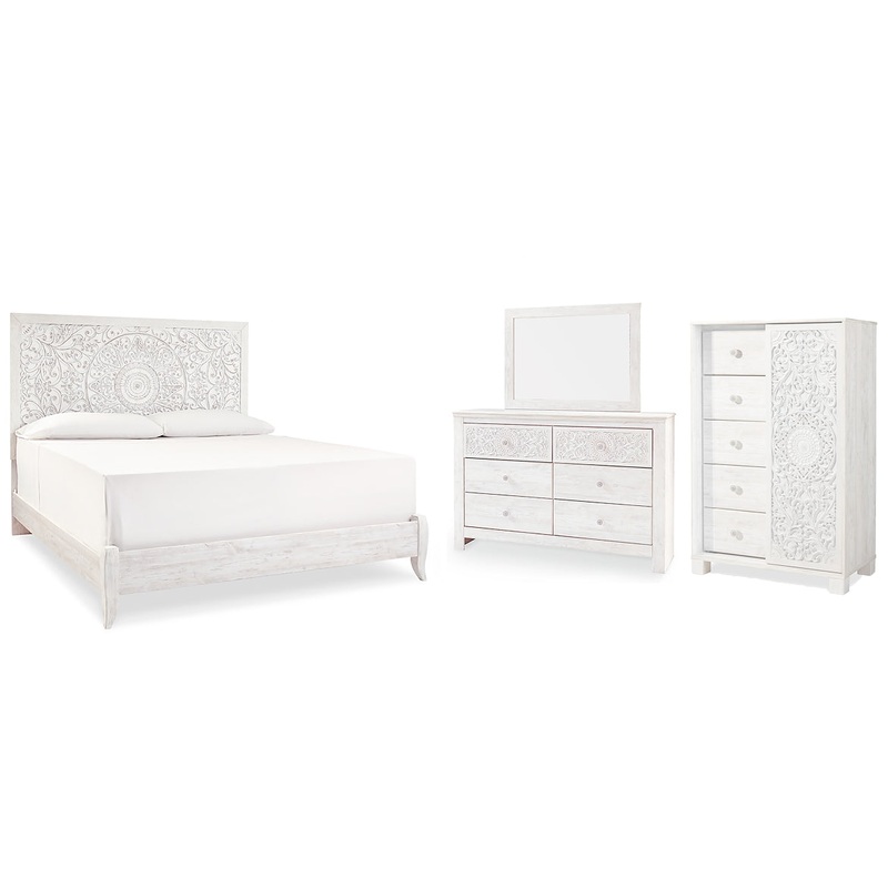 Paxberry King Panel Bed with Mirrored Dresser and Chest
