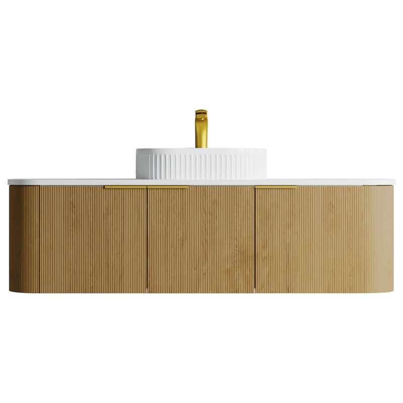 Our exquisite wall-mounted fluted 5 piece rounded bathroom vanity combination set is a unique blend of sophistication and functionality. Crafted with meticulous attention to detail, its elegant fluted design and rounded/arc side pieces add a touch of timeless charm, while ample storage space ensures your essentials stay organized. Available in White, Oak Natural and Walnut with a gloss white or matte black round fluted vessel sink. The 60″ 5 Piece Combo Set includes: 1-48″ Vanity Base (measuring 47″ with 3 soft-close doors); 2-5.125″ Arc Side Bases; 1-47″ Sintered Stone Rounded Vessel Sink Top; 1-Round Fluted Ceramic Vessel Sink