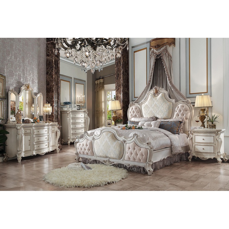 ACME Picardy California King Bed, Fabric & Antique Pearl (1Set/3Ctn), 93" x 85" x 78"H, 209Lbs. The Picardy bedroom collection brings the influence of European antiques to life with traditional carvings, detailed looping, and a gorgeous antique pearl finis