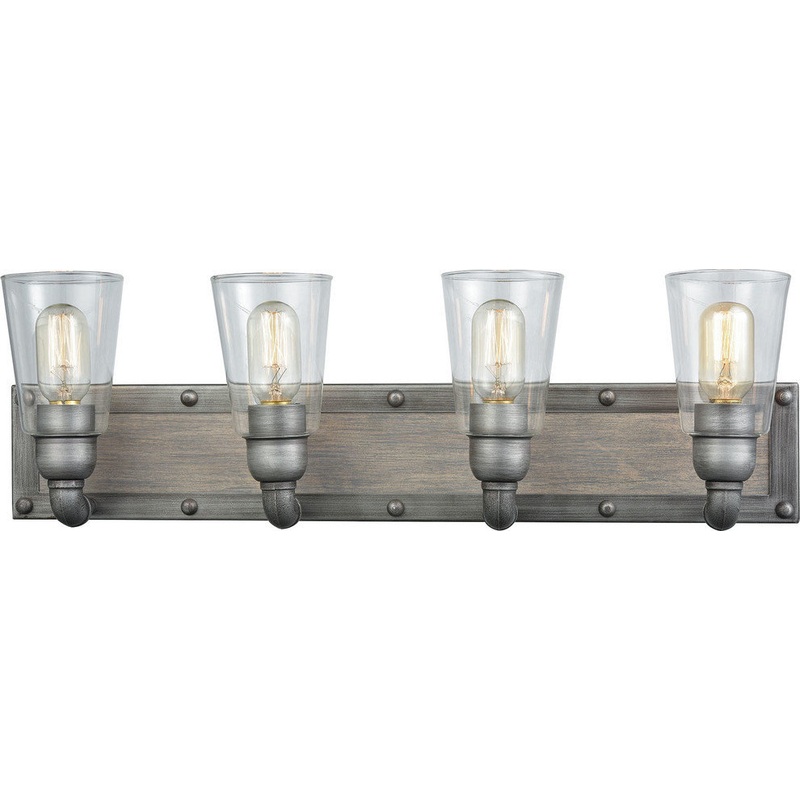 Weathered zinc finish with washed wood and clear glass vanity light. Can be hung with glass facing up or down. Pictured with filament style bulbs not included. -Bulb Type: E26 Medium -Number of Bulbs: 4 -Bulbs Included: No -UL Listed: UL Listed -Bulb Watta