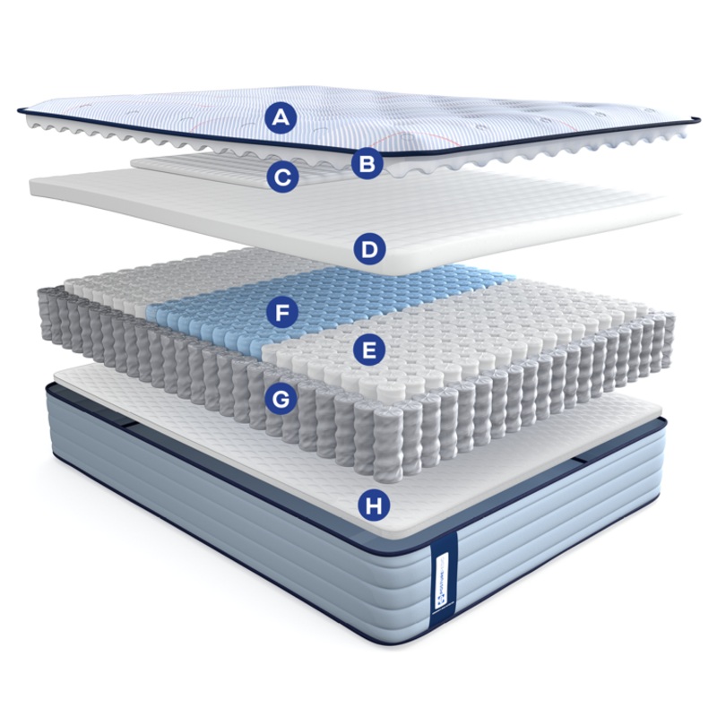 A. COVERTechnologies: Surface-Guard Technology, MoistureProtectB. QUILT2" 0.5" SealyComfort FoamC. CENTER SUPPORT0.5" SealyComfort Gel FoamD. FOAM LAYERS1.5" SealySupport Gel Foam SoftE. INNERSPRINGPosturepedic Support SystemCoil Count: 736F. CENTER SUPPOR