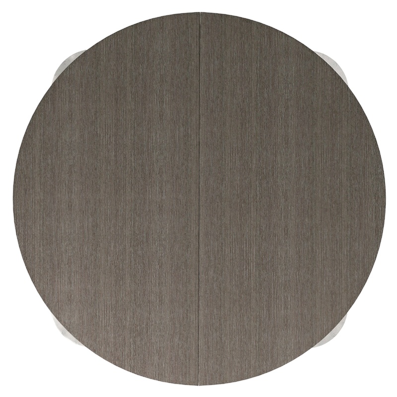 Mixed materials and texture create a modern rustic look for the Prado dining table. Four shaped cast aluminum legs in Bright Graphite finish support and surround the round wood top in a Porcini finish. The table expands to an oval shape with the addition of one leaf.
