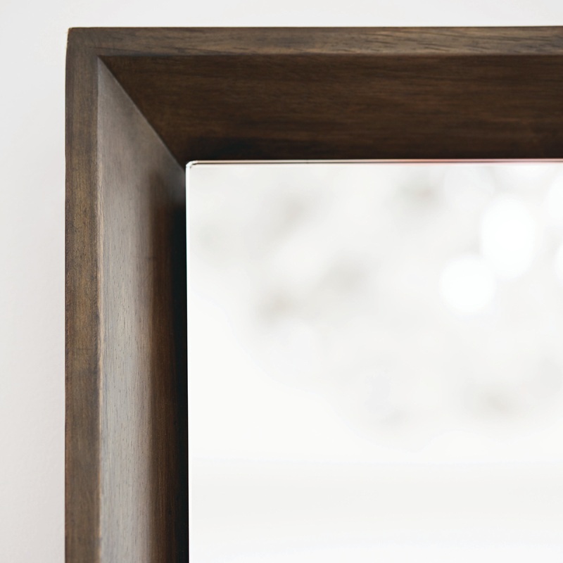 The Profile mirror balances a sleek form with a natural finish, delivering rustic modern style. The frame is crafted from flat-cut walnut veneers featuring crossfire, which is mottling or flash that occurs beneath the grain. The casual Warm Taupe finish is low-sheen with an open wood grain that emphasizes the natural color and character of the veneer. Floating mirrored glass adds dimension and depth.
