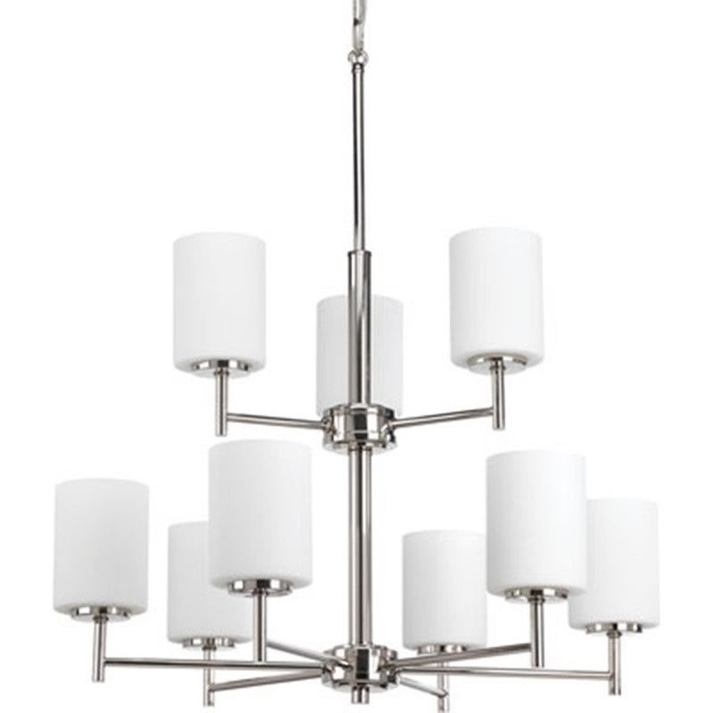 Nine-light, two-tier chandelier from the Replay Collection, smooth forms, linear details and a pleasingly elegant frame enhance a simplified modern look. Arms can be faced up or down. -Finish: Polished Nickel -Finish Type: Plated -Shade/Glass: Etched Paint