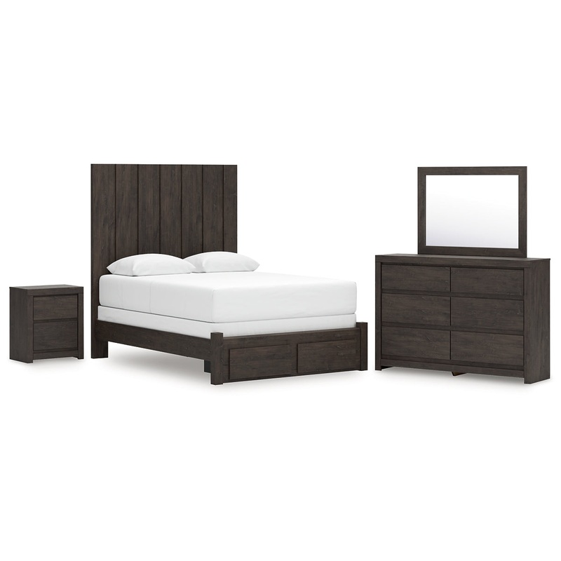 Find serene simplicity in the clean lines and dark neutral tones of this bedroom package. Its a sincere approach to modern elegance, giving you high style at a great value. A sleek hardware-less design creates a fuss-free look. Short on storage? Smooth-gliding drawers keep clothes and clutter neatly tucked away.
