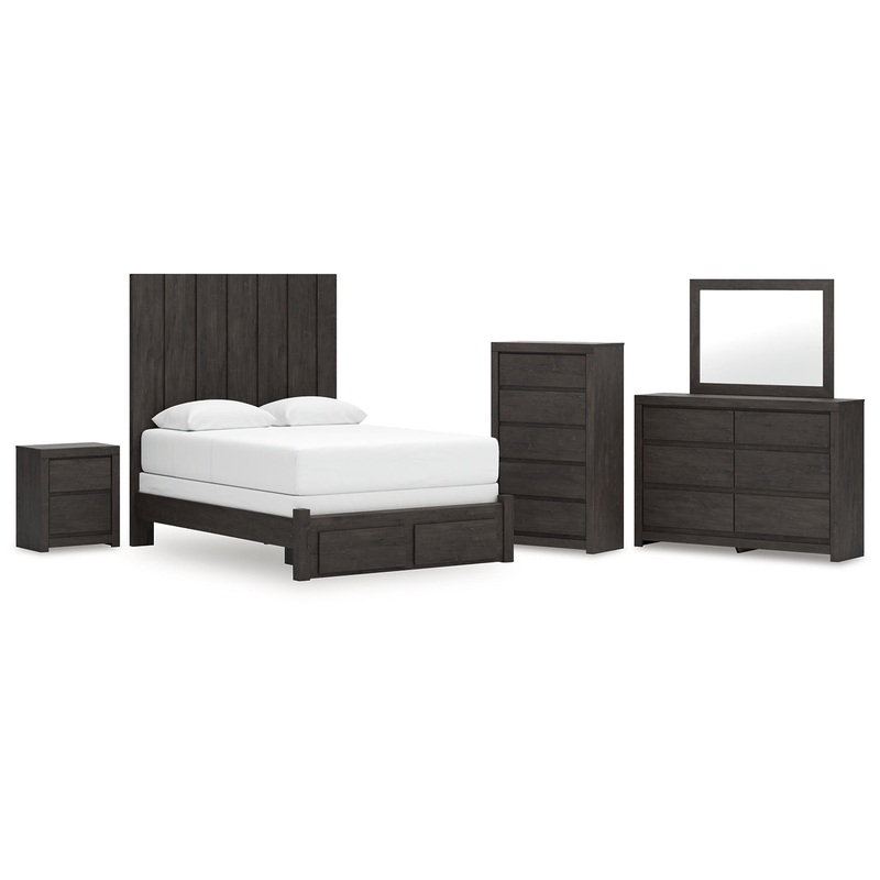 Find serene simplicity in the clean lines and dark neutral tones of this bedroom package. Its a sincere approach to modern elegance, giving you high style at a great value. A sleek hardware-less design creates a fuss-free look. Short on storage? Smooth-gliding drawers keep clothes and clutter neatly tucked away.