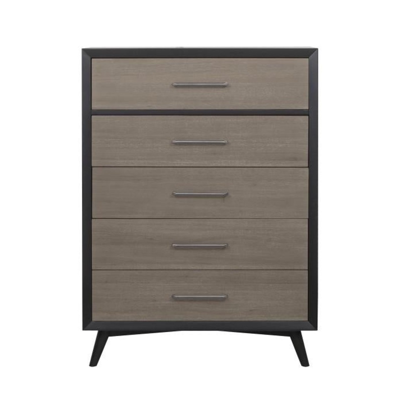 Danish mid-century modern design is well exemplified in the Raku Collection serving as stylish addition to your bedroom dcor. Classic elements of understated retro design combine with the two-tone finish - barnwood gray fronts and black profile - over waln