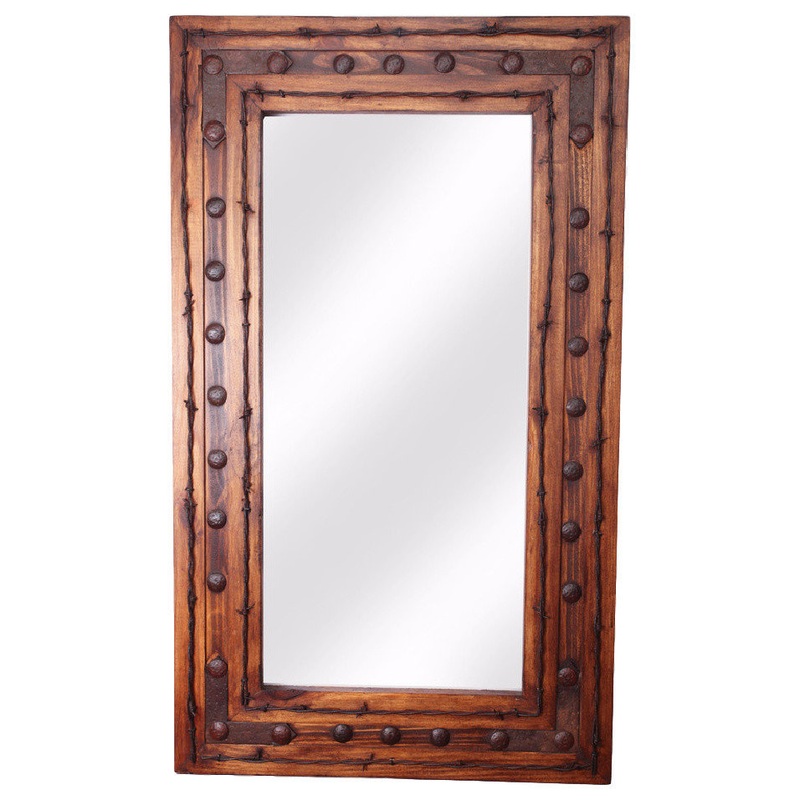 We take pine wood to create this unique mirror. It is then accented with hand hammered iron hardware and barbed wire to finish it off. You can hang this mirror vertical or horizontal simply by moving the sawtooth hanger. Model # (MPN)Rustic Mirror-Rancho A