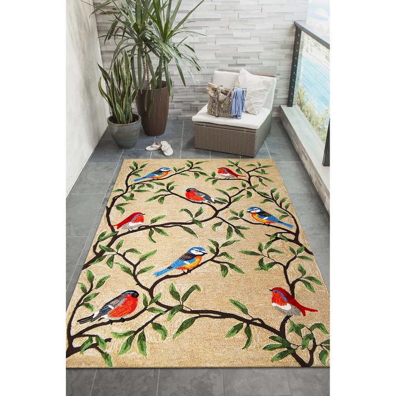 This hand-hooked area rug features a picturesque scene of colorful song birds birches on delicate tree branches. This nature inspired design will effortlessly compliment any indoor or outdoor space. Made in China from a polyester acrylic blend, the Ravella Collection is hand tufted to create vibrant multi-toned detailed designs with tight textural loops and a high quality finish. The material is flatwoven, weather resistant and treated for added fade resistance, making this area rug perfect for indoor or outdoor placement. This soft, durable area rug is ideal for your patio, sunroom or those high traffic areas such as your kitchen, living room, entryway or dining room. Intricately shaded yarns bring to life the nature inspired designs of this collection that will beautifully accent your home. Limiting exposure to rain, moisture and direct sun will prolong rug life.