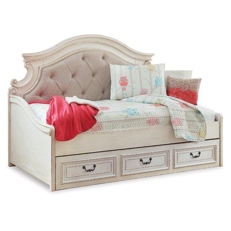 Elevating the art of traditional cottage styling, this darling day bed with storage is your dream bedroom retreat realized. A curvaceous beauty, this brilliant upholstered bed wows with dramatic scalloped details and fanciful trim work. The distressed chipped white finish charms with its heirloom appeal. Deep tufting on the cushioned upholstered bedstead adds such a cozy element sure to put you at ease. Mattress available, sold separately.