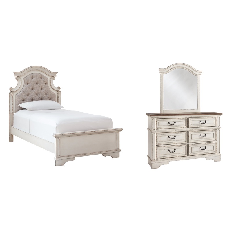 Details B743B12: Made of veneers, wood and engineered wood, with cast resin components, Antiqued two-tone finish, 6 smooth-gliding drawers with dovetail construction, Dark bronze-tone hardware, Mirror attaches to back of dresser, Assembly required, Includes tipover restraint device, B743B13: Made of veneers, wood and engineered wood, with cast resin components, Includes upholstered headboard, footboard and rails, Distressed, chipped white finish, Upholstered headboard with foam cushion, button tufting, Assembly required, Mattress and foundation/box spring available, sold separately, Bed is compatible with an adjustable base,