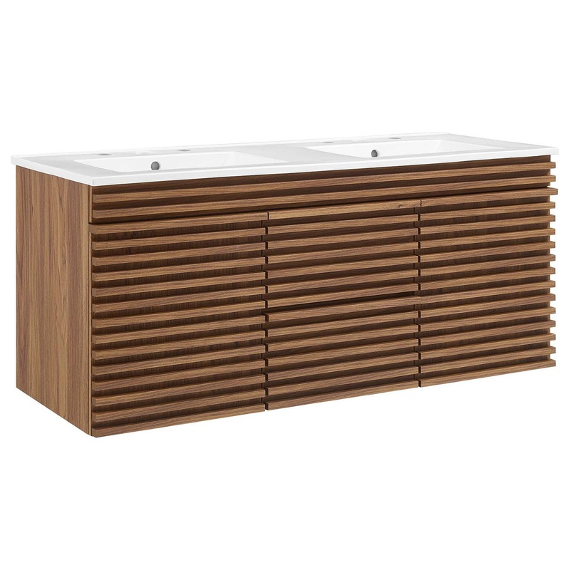 Tap into mid-century aesthetics with the Render Vanity. The Render 48″ Double Sink Bathroom Vanity features a durable MDF and particleboard frame with a smooth laminate, ample storage space in two full-extension drawers, adjustable shelves behind soft-close hinged doors, and a space-saving wall-mount design. Two curved ceramic basins with an integrated countertop and 8″ centerset faucet holes creates sleek lines and a crisp design for an edgy look designed to meet your needs. Boasting a mid-century modern style this vanity features a solid construction with a pleasing look and practical functionality. Assembly required. Fixtures not included.