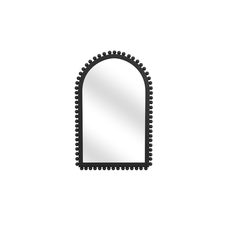 The Renn Wall Mirror features a rectangular shape with an arched top and is studded with whimsical wooden spheres. The mirror frame features a black finish.