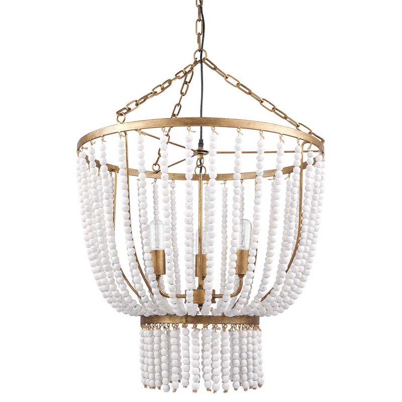 The Rhone 3-light Chandelier has a painted antiqued gold metal frame and painted white wooden beads.