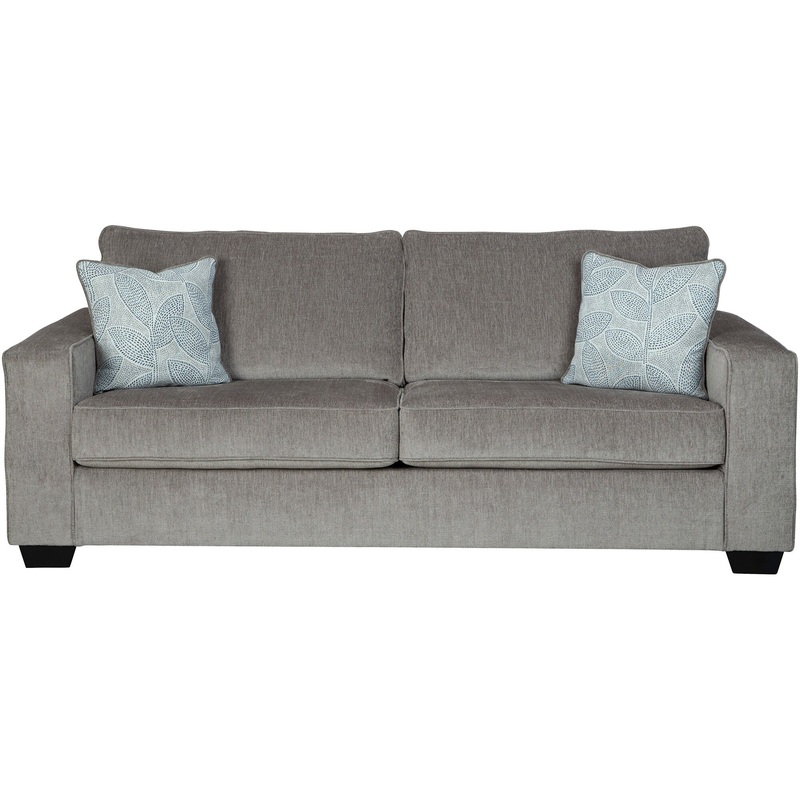 The Riles Sofa brings a blend of simplicity and modern elegance to your home. Whether youre dressing up your living room for formal entertaining or relaxing with family, this sofa adapts effortlessly to your needs. Its neutral tone and clean, contemporary design allow it to complement both the rest of the Riles collection and your existing decor. Built with a corner-blocked frame, high-resiliency foam cushions, and thick poly fiber wrapping, the Riles Sofa promises long-lasting comfort and support. The subtle beauty of its exposed faux wood feet, paired with two decorative pillows, adds a touch of sophistication and comfort to any space.With its chenille-feel upholstery, sleek track arms, and simple yet striking silhouette, the Riles Sofa is the perfect centerpiece for any room. Available in a beautiful neutral Alloy shade, this sofa fits seamlessly into any home, offering both function and style in one.
