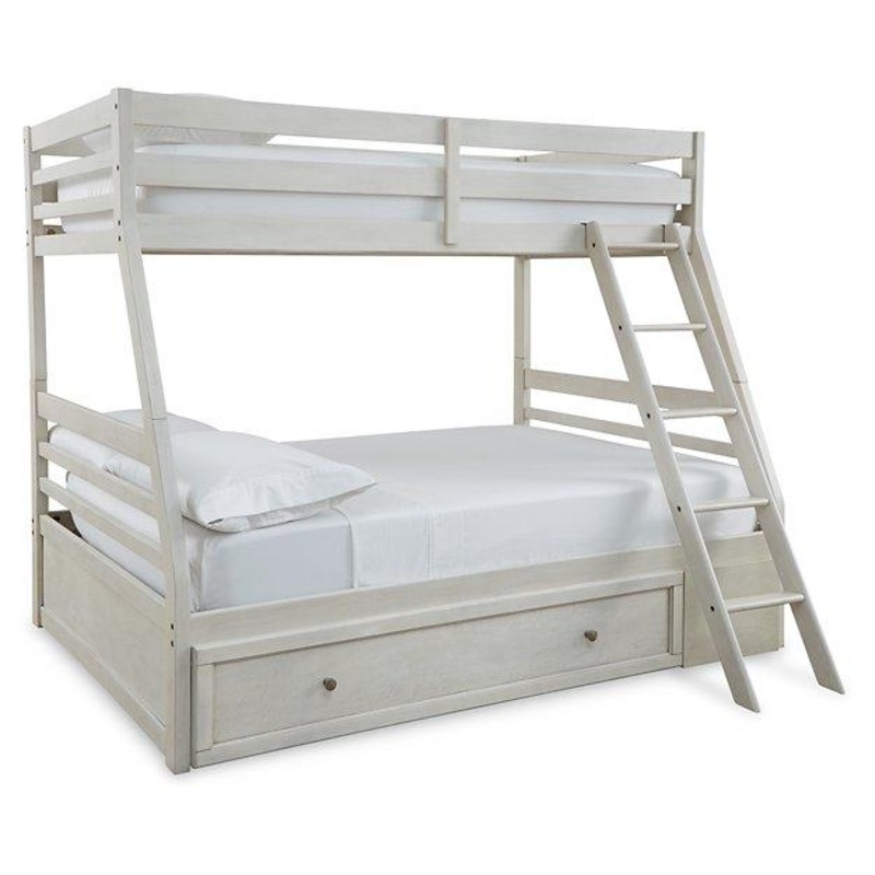 Elegant, timeless furnishings take your bedroom to the next level. Nothing does that better than this twin over full bunk bed. The antiqued white finish with a wonderful grain texture gives this youthful bed a sophisticated touch. Under bed storage makes this the perfect piece to add a layer of function to your tasteful bedroom.