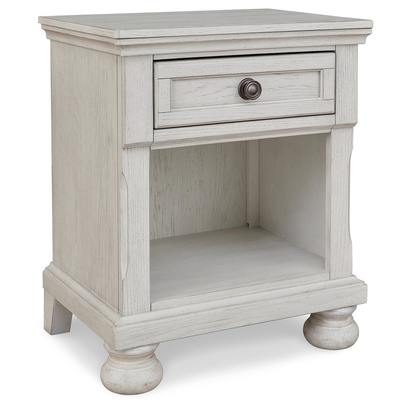 Elegant, timeless furnishings take your bedroom to the next level. Nothing does that better than this nightstand. The antiqued white finish with a wonderful grain texture radiates sophistication, while a dark bronze-tone knob adds an ornate touch. A single drawer and open bookcase cubby allow for versatile storage or display options, making this nightstand a functional favorite.