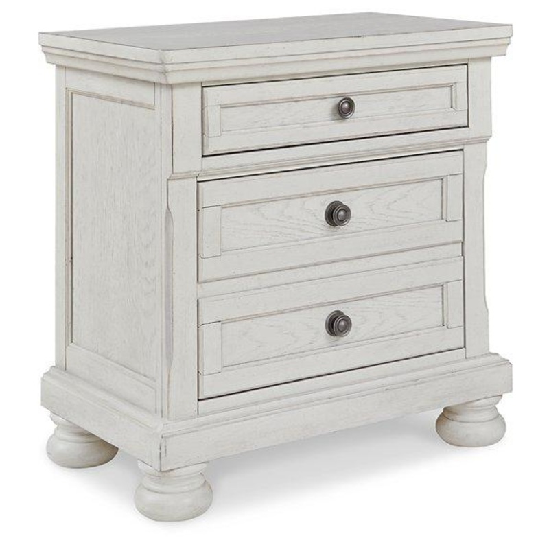 Elegant, timeless furnishings take your bedroom to the next level. Nothing does that better than this nightstand. The antiqued white finish with a wonderful grain texture radiates sophistication, while the dark bronze-tone hardware adds an ornate touch. A