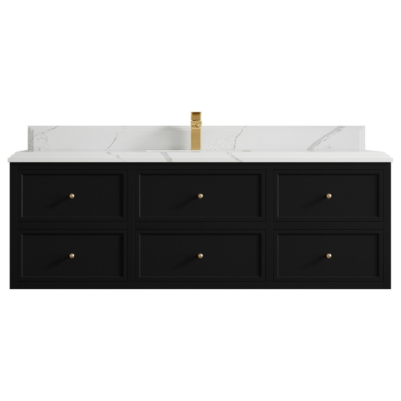 Willow Collection Roswell 60 x 22 Single Sink Bath Vanity in Black with 1.5" Straight/ Mitered Edge Calacatta Laza The Roswell Collectionis a stunning bathroom vanity that exudes artistry and quality craftsmanship. This premium vanity is made from solid Bi