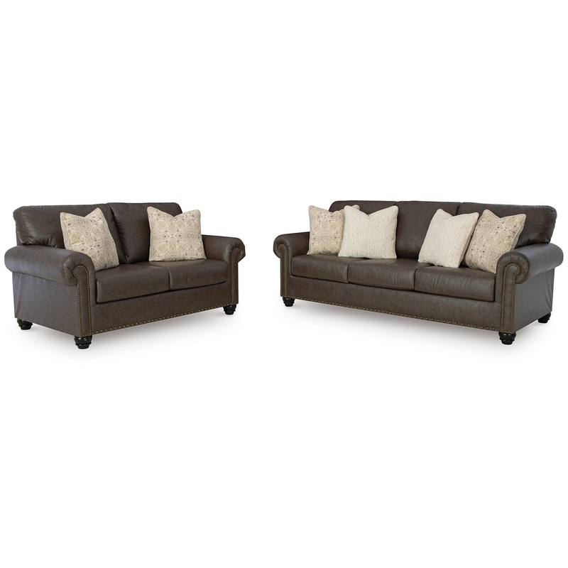 This seating package marries classic character with a contemporary attitude. Love the timeless look of leather? Its take on deep brown faux leather is versatile enough to pair with styles from traditional to modern, at a price that wont break the bank. Details like nailhead trim and decorative turn legs polish off the set with flair.