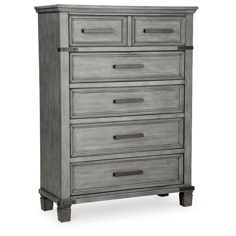What’s old is what’s new with this chest. Serving up a fresh look in urban farmhouse style, the eclectic piece features a light weathered gray finish with dark aged bronze-tone bar pulls and metal straps for a casually cool sensibility. Profiled drawer frames, thick-profiled top moulding and tapered legs are the earmarks of timeless design.
