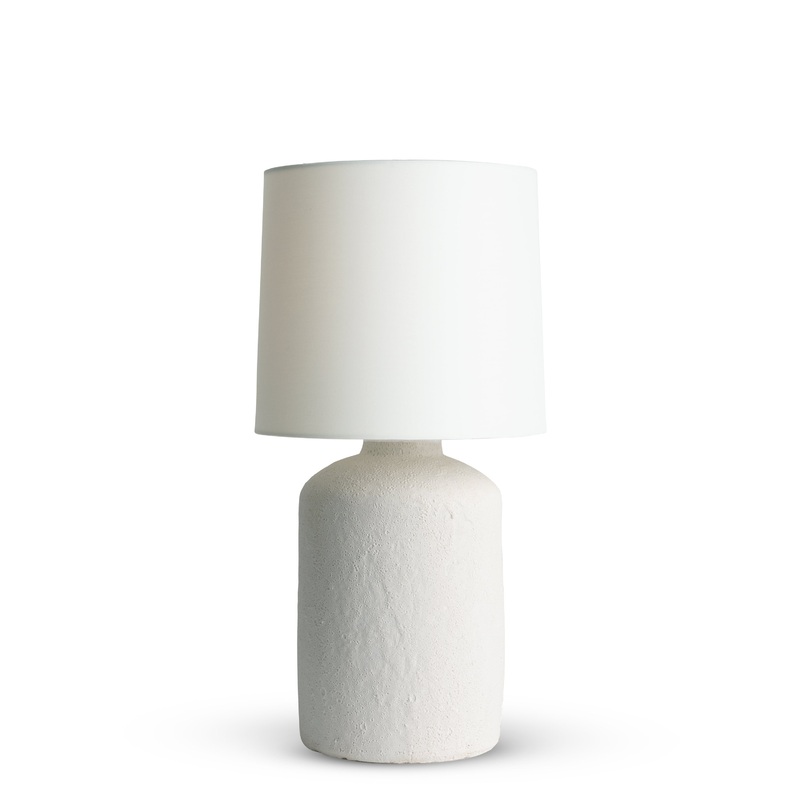 A sophisticated textured imprint across the tapered base highlights the beauty of this diminutive table lamp. A classic look with a modern touch of detail that pairs perfectly with the off-white linen fabric shade. This neutral, yet striking, lamp will ble