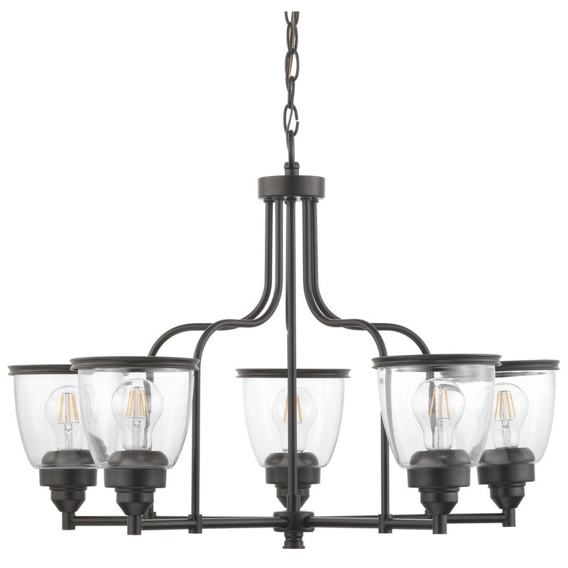 The Saluda Collection features a gently curving frame paired with clear glass shades. Each shade is accented with a banded ring to carry through the theme of finely crafted metal fittings. The design lends itself to Farmhouse, Coastal and Transitional spaces. Uses 5 60 W medium base bulbs.