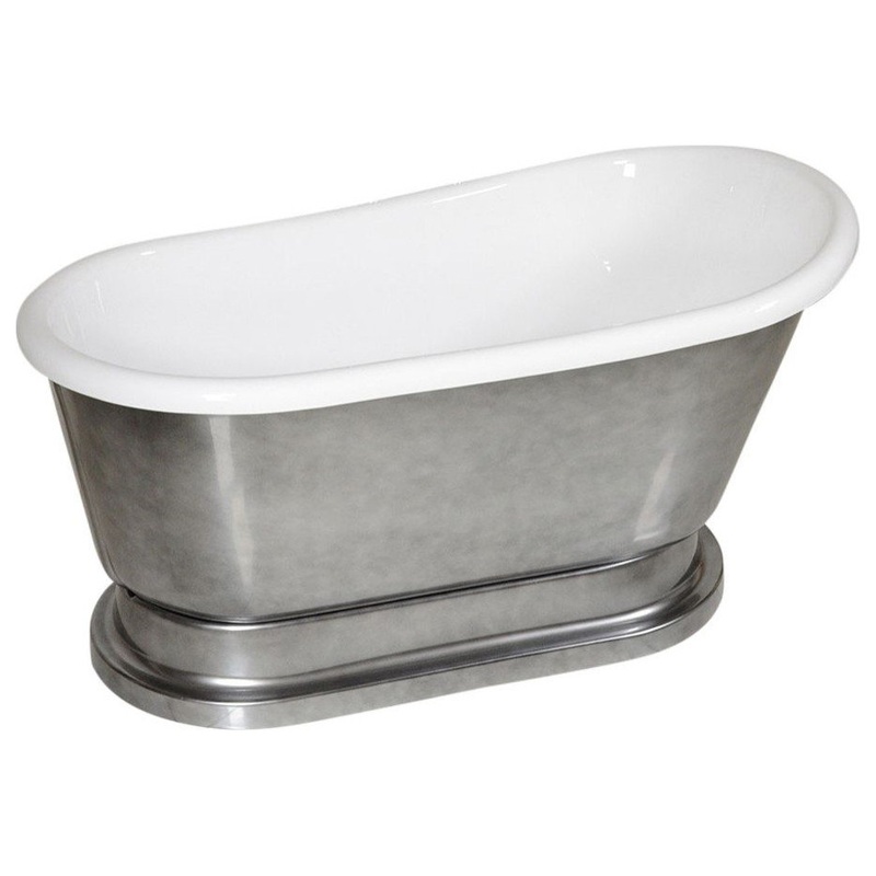 Product DetailsA simply beautiful Iris-58 – 58″ Swedish slipper pedestal tub offers a generous amount of bathing space for a small bathtub. The interior of the tub is high gloss bright white with an metal look Aged Chrome exterior. This delightful Swedish slipper pedestal bathtub is larger inside than most regular small tubs and the narrow roll top lip finishes its’ minimalist look. It offers an excellent bathing space for a small tub and the extra width makes it feel even more roomy and luxurious. To make installation simple, it incorporates an integrated pop-up drain. This means no cutting at all to install.