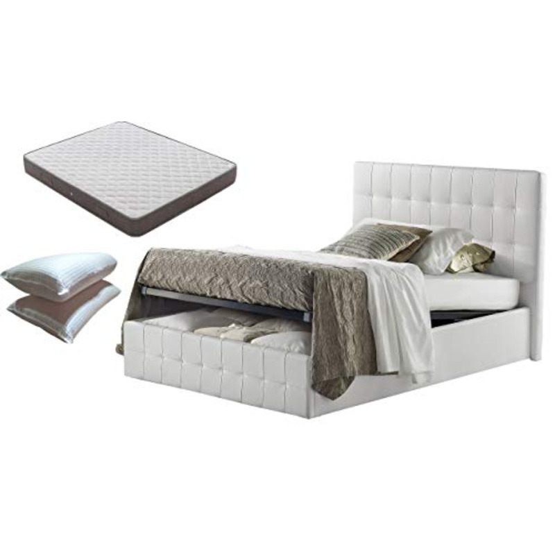 SARDAMATERASSI-Letto piazza e mezza con Box Contenitore bianco + Materasso piazza e mezza altezza 20 cm+ guanciale memory saponetta sfoderabile