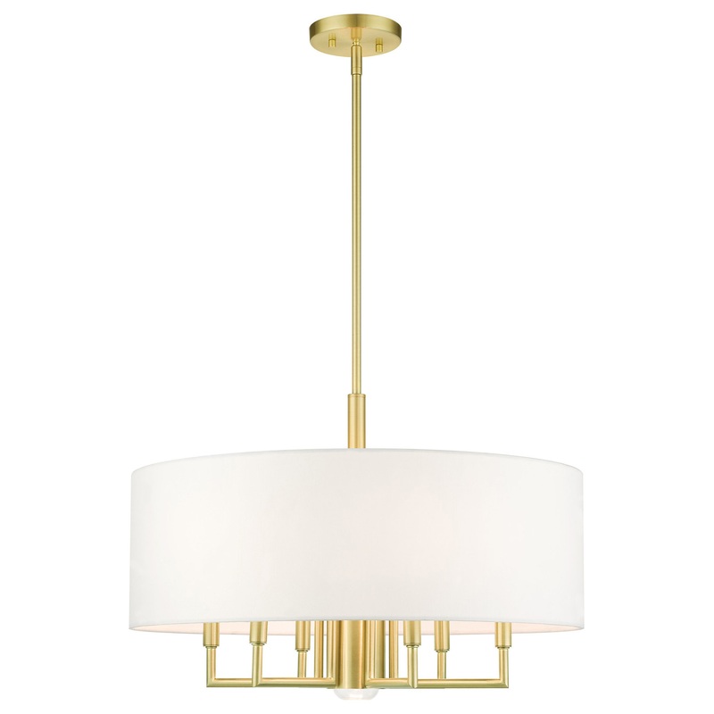 The Meridian collection has a clean, crisp look and contemporary appeal. The hand-crafted off-white fabric hardback shade offers a diffused warm light. This seven-light pendant chandelier has exposed angular arms featuring one down light. Will adapt well in the living room, dining room and bedroom. This sleek design is shown in a satin brass finish.