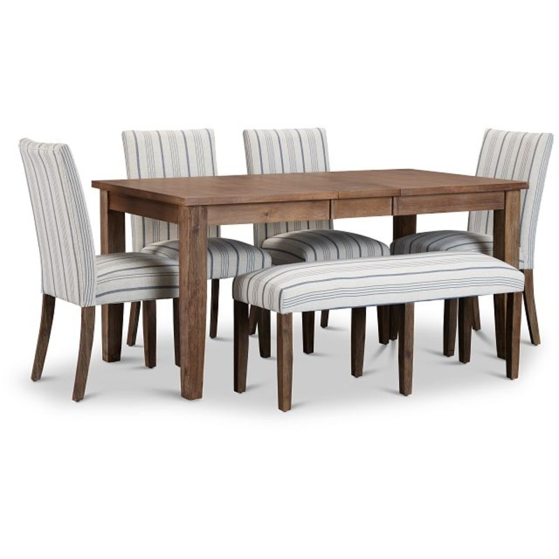 Model: 9726980Assembly required: yesProduct care: clean with clean damp cloth no chemicalsTable length without leaves: 96Intended use: indoorFabric colors: graySeat height: 13.98Seat cushion core material: foamLeg color: mid toneConstruction: solid wood fr