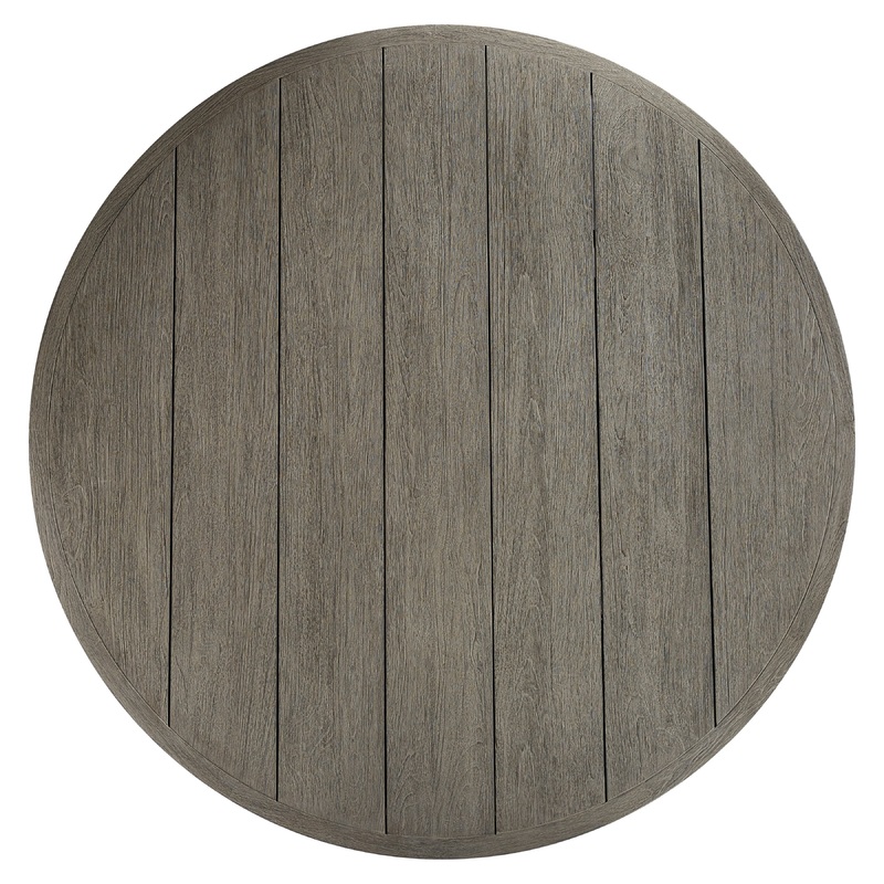Round plank-look Teak top in Weathered Teak finish.Chiseled-look textured pedestal base of glass-reinforced concrete in rough Textured Quarry finishUneven, rounded shape on base.Stainless Steel adjustable glides.The Savona outdoor dining table highlights m