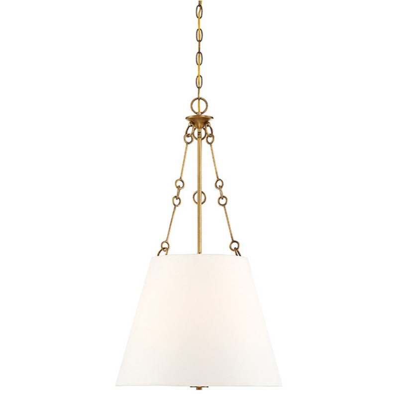 This Savoy House Austin 4-light pendant has a crisp and transitional style with a large white fabric shade that obscures the light sources, creating a soft and comfortable glow. warm brass finish. Pendants are extremely versatile and can fit in many different spaces, such as kitchens, family rooms, great rooms, foyers, entryways, offices, bedrooms and bathrooms. Because this pendant is chain-hung, you can use as much or as little chain as you need to fit your specific hanging height needs, and this pendant can be used on a sloped ceiling. Bulb not included. You can pair Austin with hardware finished in brass or mix it with hardware in other finishes. Its subtle elegance means it is a perfect choice for rooms of any decor style. When you choose a Savoy House lighting fixture, you can be certain you’ve selected a piece that will withstand the test of time.