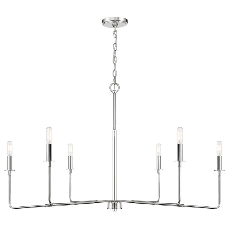 Rustic charm and an expansive reach define the Salerno Collection, which beautifully enhances a large space without taking the attention away from other design elements in the room. Measuring 42″ wide x 25″ high, the six-light chandelier offers ample illumination from six 60-watt candelabra bulbs. The Polished Nickel finish brings a touch of glam.